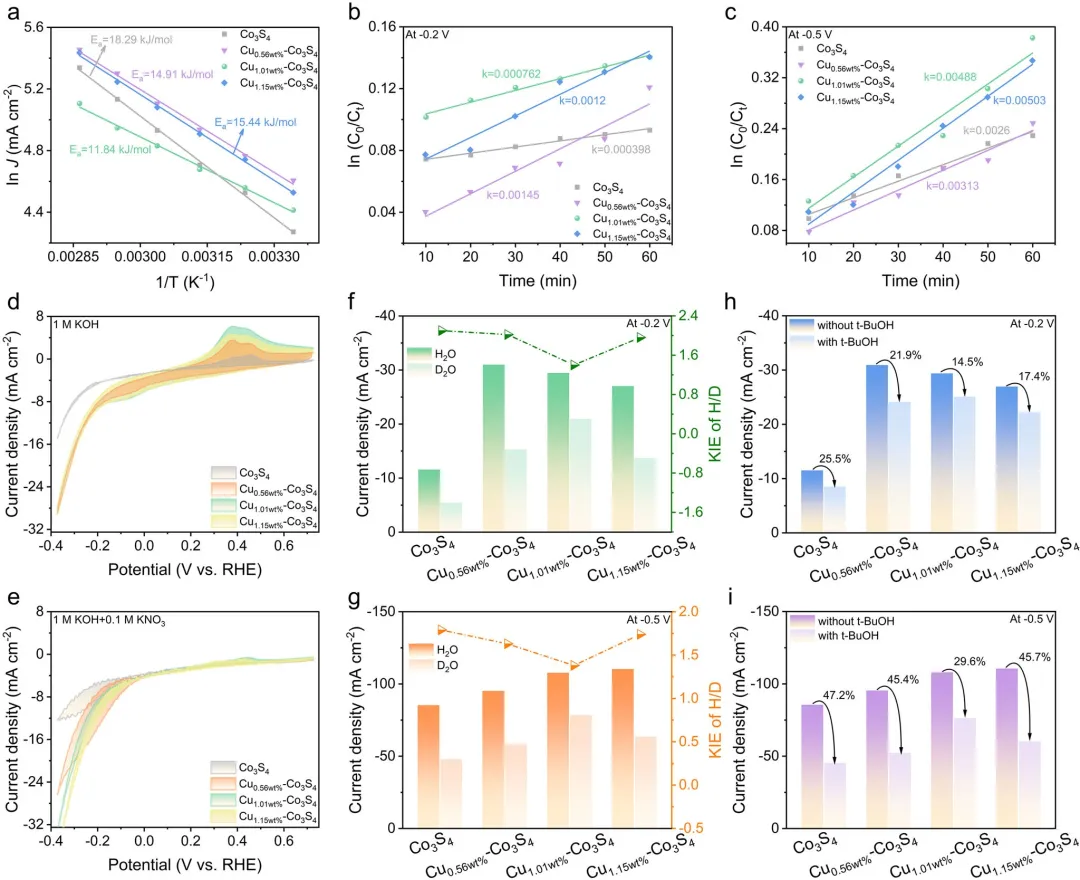 图3 (a) 合成催化剂的Ea值。(b) -0.2 V和(c) -0.5 V下的线性化准一级动力学曲线。样品在(d) 1 M KOH和(e)含0.1 M KNO₃的1 M KOH中的CV曲线。几种催化剂在(f) -0.2 V和(g) -0.5 V下的KIE。(h) -0.2 V和(i) -0.5 V下,催化剂在有或无t-BuOH时的电流密度变化。