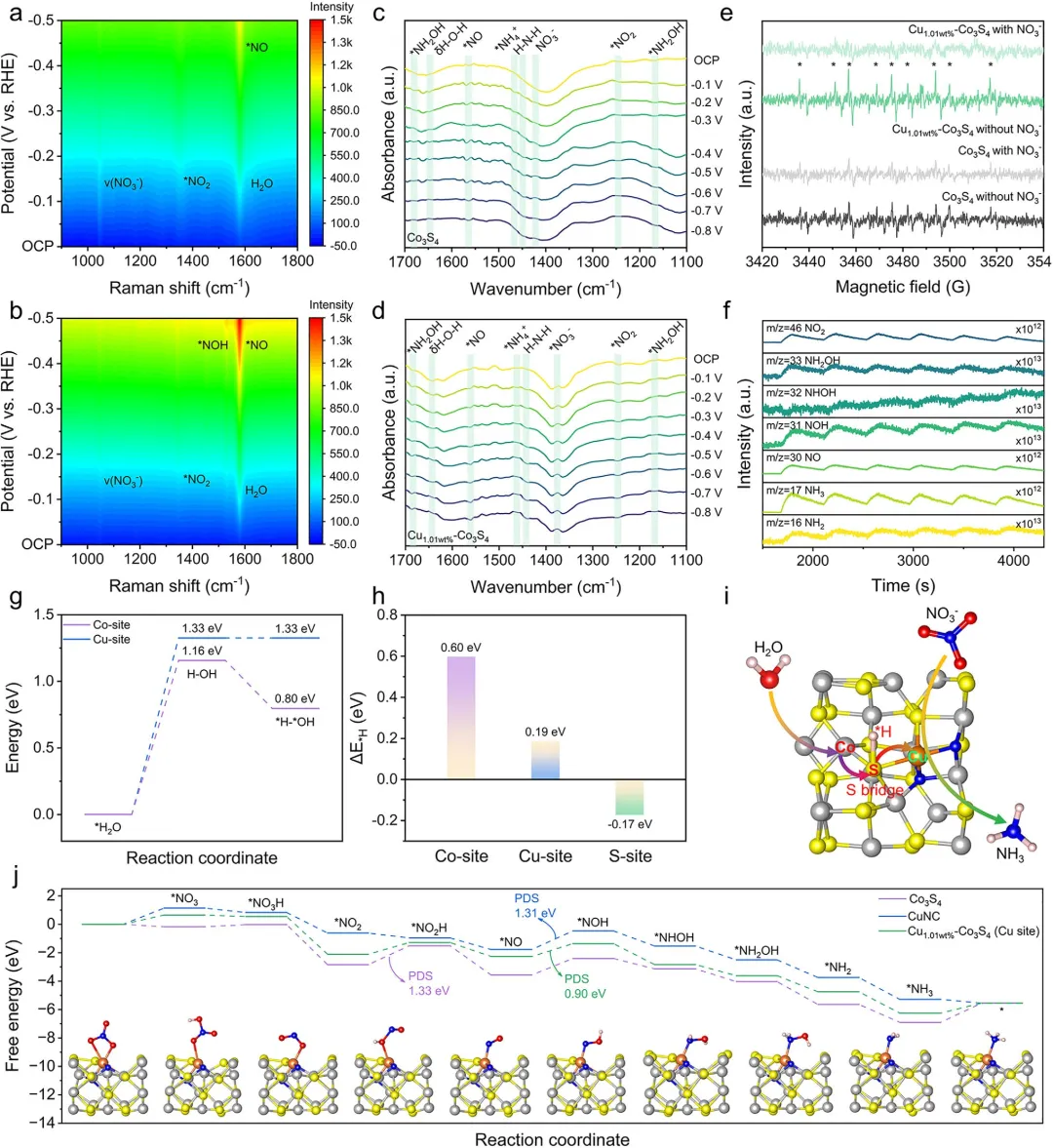 图4 | (a, b) Co₃S₄和Cu₁.₀₁wt%-Co₃S₄在给定电位下的原位拉曼光谱和(c, d)原位FT-IR光谱。(e) Co₃S₄和Cu₁.₀₁wt%-Co₃S₄在1 M KOH(含或不含0.1 M KNO₃)中于-0.8 V电解后电解质的准原位EPR谱图。(f) Cu₁.₀₁wt%-Co₃S₄在-0.8 V下的电化学在线DEMS。(g) Co位点和Cu位点上水分解的能垒。(h) Cu₁.₀₁wt%-Co₃S₄的Co、Cu和S位点上的活性氢吸附能。(i) 在Cu₁.₀₁wt%-Co₃S₄上通过S桥进行反向氢溢流的水分解和NO₃RR示意图。(j) Co₃S₄、CuNC和Cu₁.₀₁wt%-Co₃S₄上NO₃RR的吉布斯自由能图。