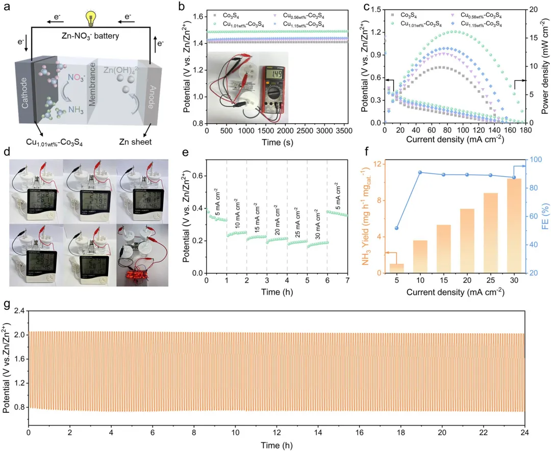 图5 | (a) 使用Cu₁.₀₁wt%-Co₃S₄的Zn-NO₃⁻电池放电过程示意图。(b) 使用所制备催化剂的开路电压和(c) 放电极化和功率密度曲线。(d) 由使用Cu₁.₀₁wt%-Co₃S₄的Zn-NO₃⁻电池供电的温湿度时间传感器和LED显示屏面板的数码照片。使用Cu₁.₀₁wt%-Co₃S₄的Zn-NO₃⁻电池在不同电流下的(e) 放电性能测试和(f) 相应的产率和FE。(g) 使用Cu₁.₀₁wt%-Co₃S₄的Zn-NO₃⁻电池在1 mA cm⁻²下的重复充放电循环。