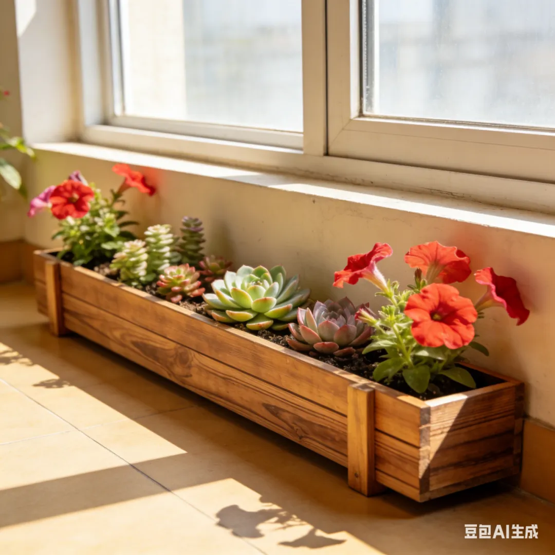 小户型阳台首选窄款长条防腐木花箱,30-40cm窄身设计不占空间,靠墙摆放不挡采光,温润实木纹理适配各类家居软装、鱼缸摆件,种花种菜、搭多肉都合适,轻松打造治愈系阳台小花园。