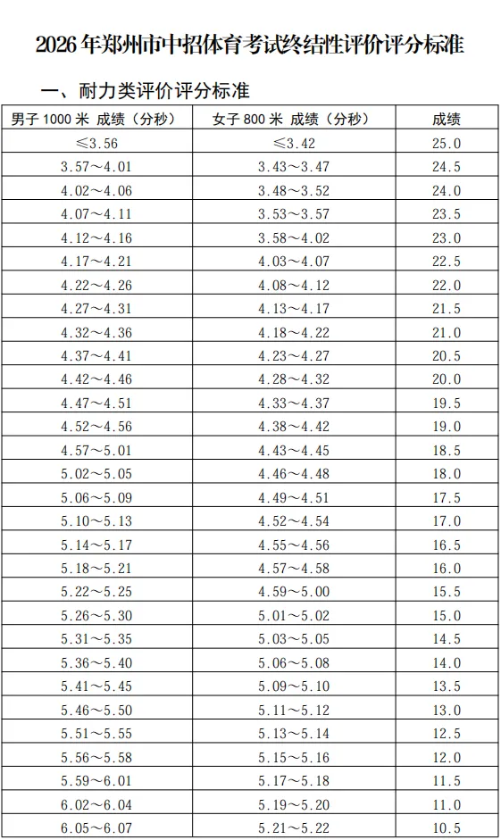 重要!2026 年郑州市中招体育考试终结性评价评分标准