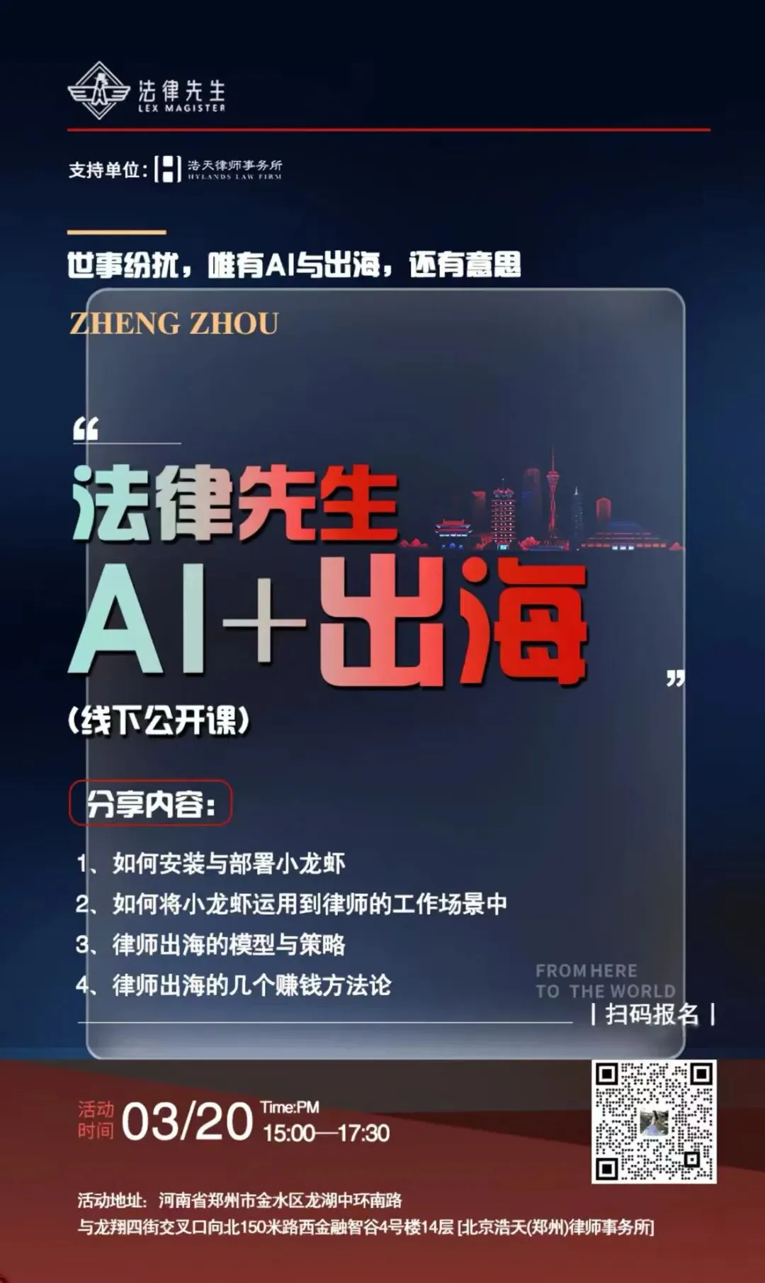 在全球化浪潮与人工智能技术革新的双重驱动下,当法律遇上 AI,当专业走向世界,如何借助 AI 工具提升专业效能?如何布局海外法律服务市场?北京浩天(郑州)律师事务所特邀国内知名法律科技公司「法律先生」,共同呈现AI + 出海专业线下公开课,为行业同仁搭建深度交流与实战赋能的专业平台。