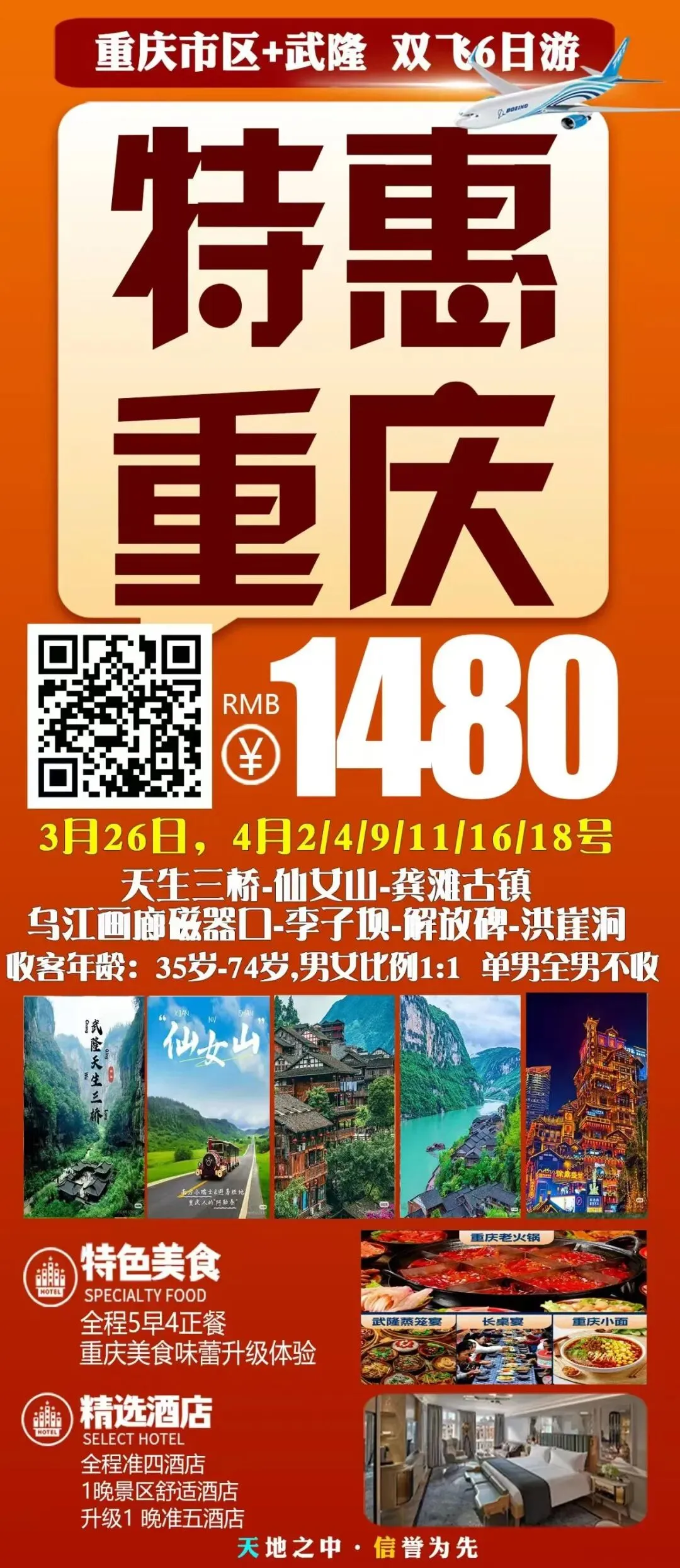 ✈【特惠重庆】重庆市区+武隆双飞6日游,郑州起止,每位1480元,团期:2026年3月26日~4月18日