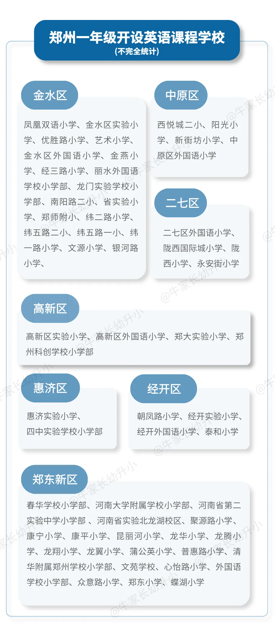 郑州市多个区域的小学已在一年级开设英语课,结合家长反馈和网上资料,以下部分名单供您参考: