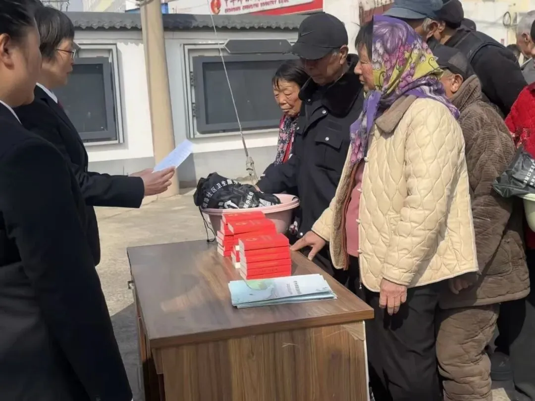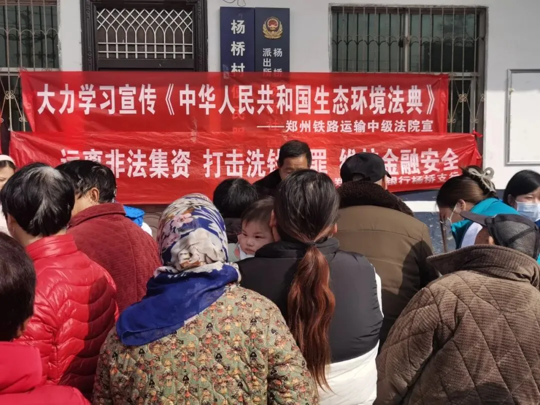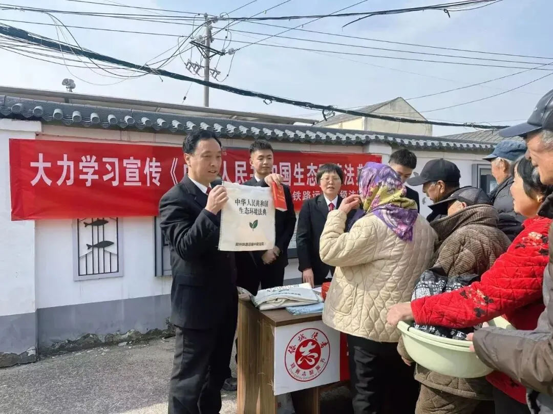 上午9时,杨桥村党群服务中心的广场上,一条印有“大力学习宣传贯彻《中华人民共和国生态环境法典》的红色横幅在春风中格外醒目。郑铁中院设置的宣传台前,摆放着刚购置的《生态环境法典》读本、宣传折页以及环保袋等生活用品,吸引不少村民驻足参与。