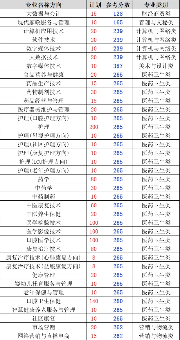 郑州医药健康职业学院2025年对口招生专业录取参考分数