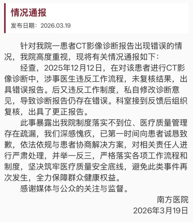 广州女子体检同一部位的CT报告“两周三变”,从肿瘤到没事,险遭不必要手术。3月19日,南方医院通报:涉事医生违反工作流程出具错误报告,后又私自修改导致报告仍错误,科室复核后出具更正报告。