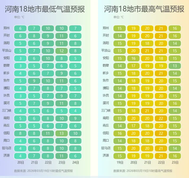本周未来几天,河南的天气晴天控场,大风、零星小雨穿插。目前,河南最高气温正逐步回升,周六周日,全省大部最高气温将达20℃上下,最低气温北部、西部达6℃~8℃,其他地区10℃上下,部分地区昼夜温差普遍超过10℃。