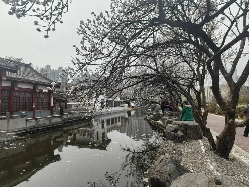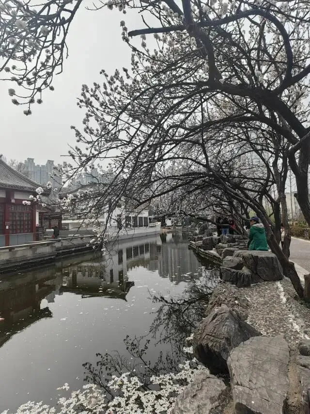 隋河宋肆是京杭大运河的一段,前些年政府在这里修建了一处仿宋建筑。白墙黛瓦,配着石舫、溪流,很江南的感觉。点睛之处,是在溪旁种了十几株山杏。每当初春,杏花烂漫,这里便成了市民打卡的好去处。