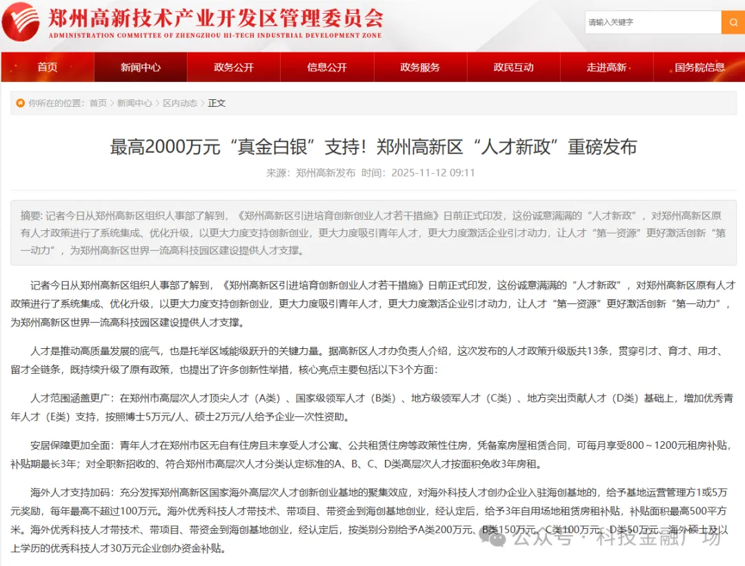 2025年,高新区印发《郑州高新区引进培育创新创业人才若干措施》,通过13条诚意满满的举措,贯穿引才、育才、用才、留才全链条。