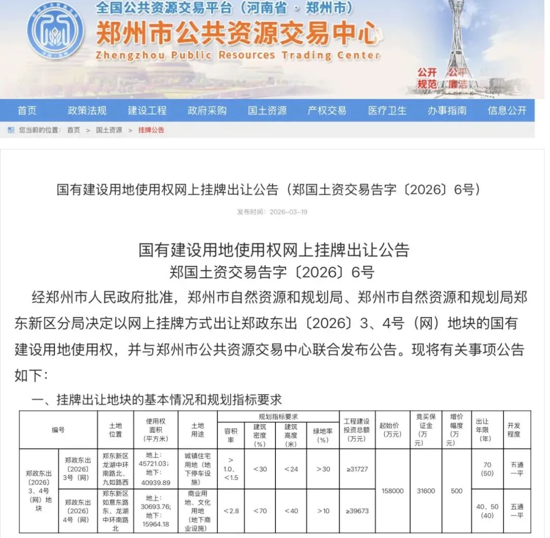 今天,郑州市公共资源交易中心发布了(2026)6号挂牌出让公告,同时挂出了一宗住宅用地、一宗商业文化用地。