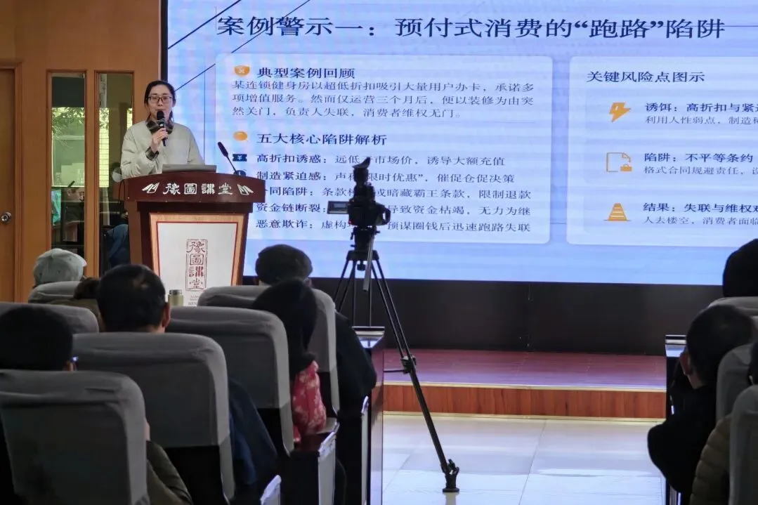 讲座紧扣《中华人民共和国消费者权益保护法》,系统解读消费者法定权利、维权渠道、证据留存等关键要点,为市民绘制清晰的维权路线图。同时聚焦消费投诉热点,以案释法剖析预付式消费跑路、网络消费隐形陷阱、老年消费欺诈三类高频风险,逐一给出针对性防范建议。