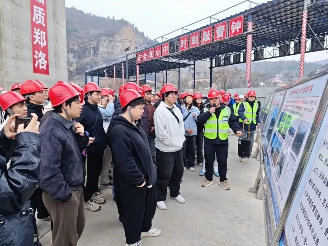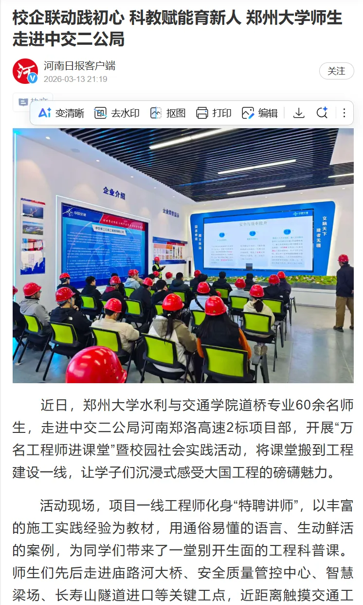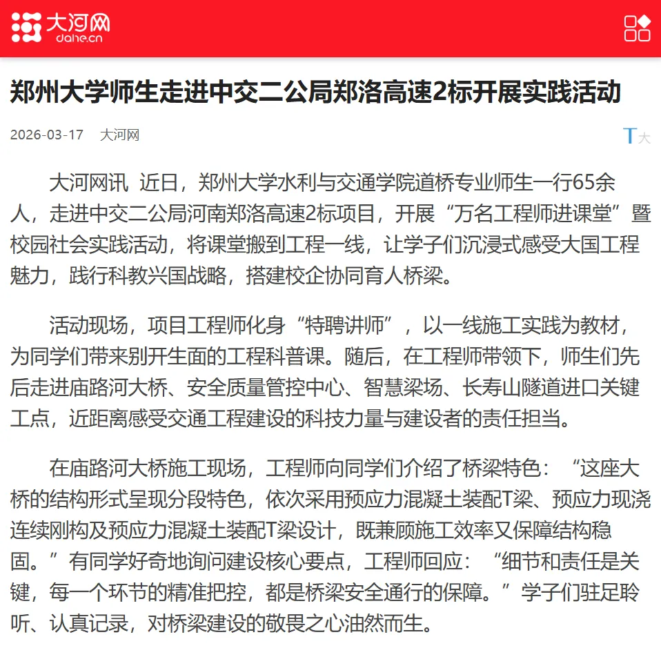 近日,郑州大学水利与交通学院道桥专业师生一行65余人,走进中交二公局河南郑洛高速2标项目,开展“万名工程师进课堂”暨校园社会实践活动,将课堂搬到工程一线,让学子们沉浸式感受大国工程魅力,践行科教兴国战略,搭建校企协同育人桥梁。