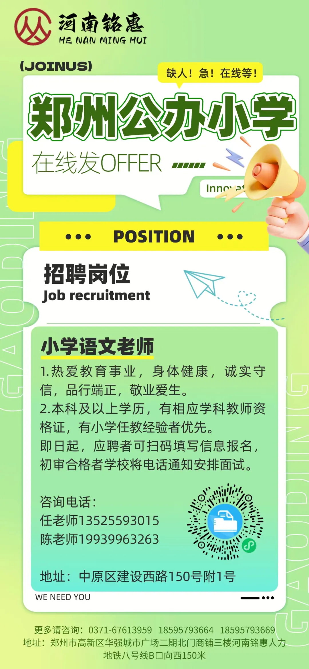 郑州公办小学急需语文老师