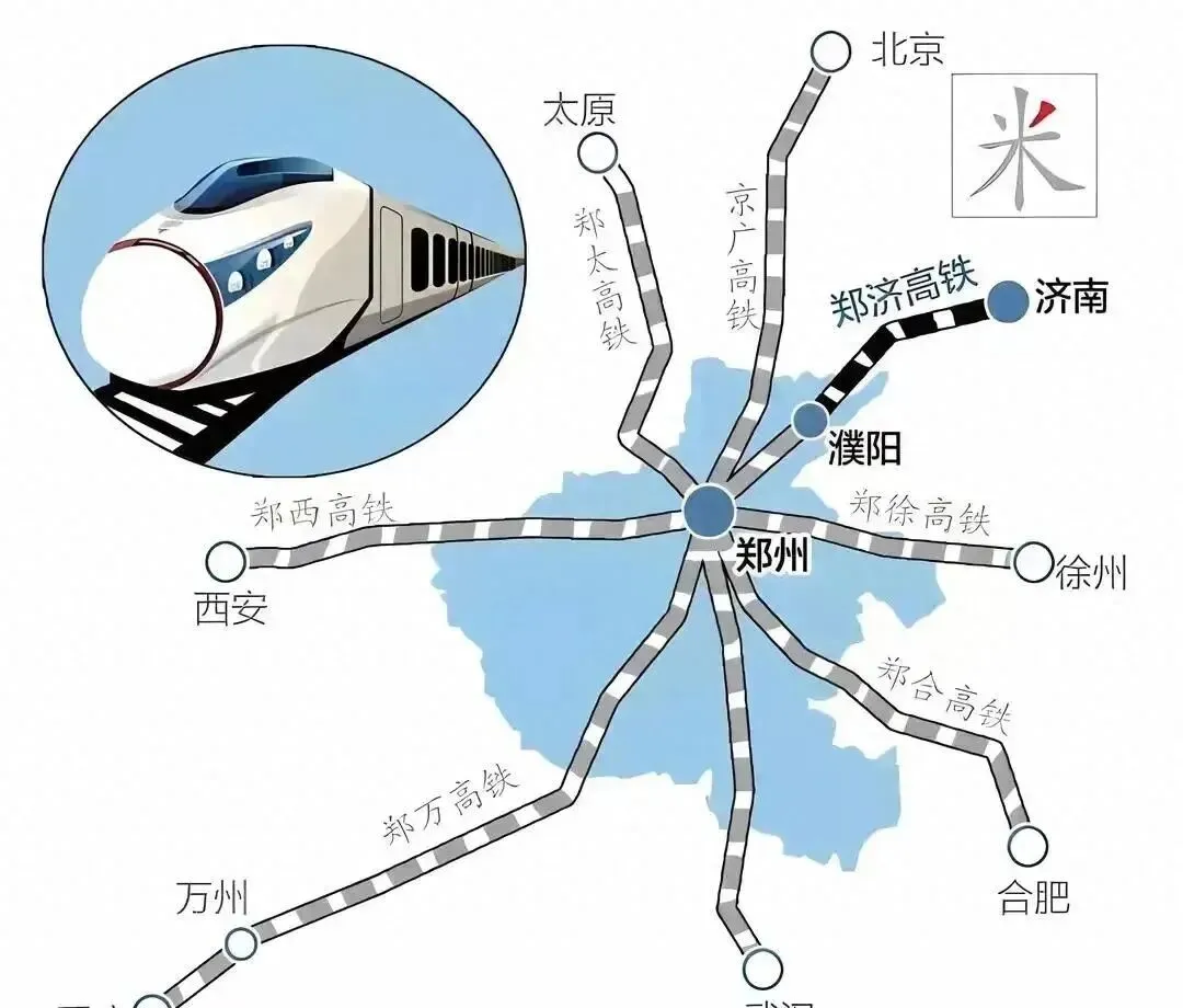 普速铁路方面,京广铁路、陇海高铁在郑州站交汇;高铁方面,京广、徐兰、郑渝、郑阜、郑太、济郑组成了“米字型”高铁网。
