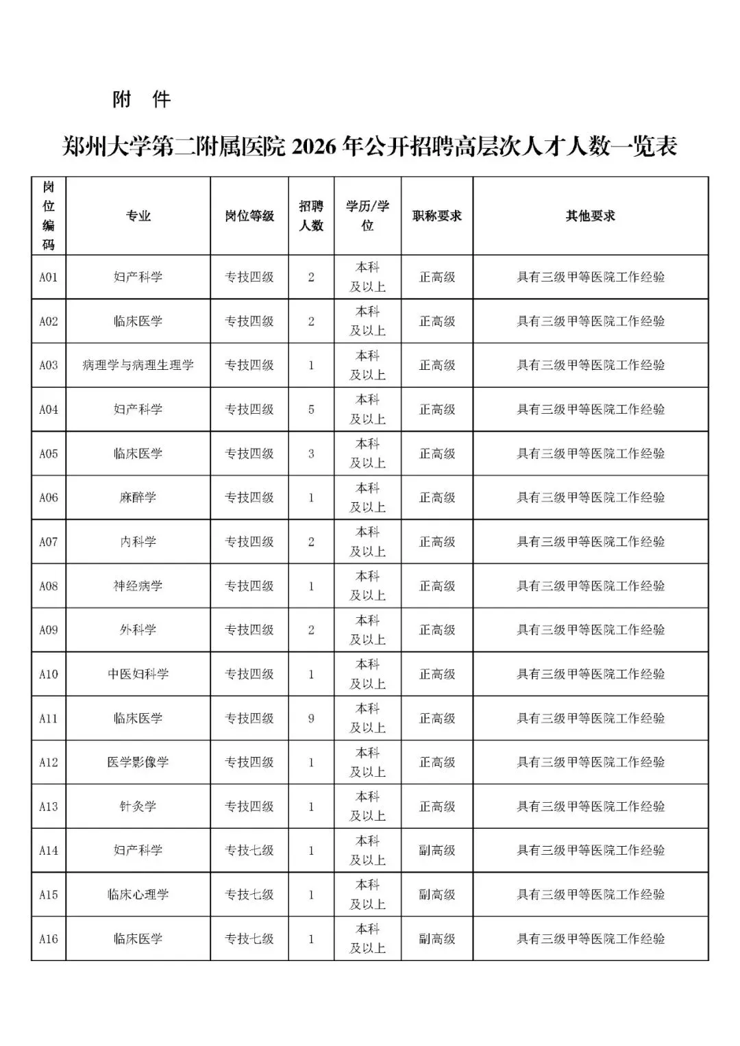招聘博士研究生、副高级及以上职称70名,具体岗位专业详见附件《郑州大学第二附属医院2026年公开招聘高层次人才人数一览表》。