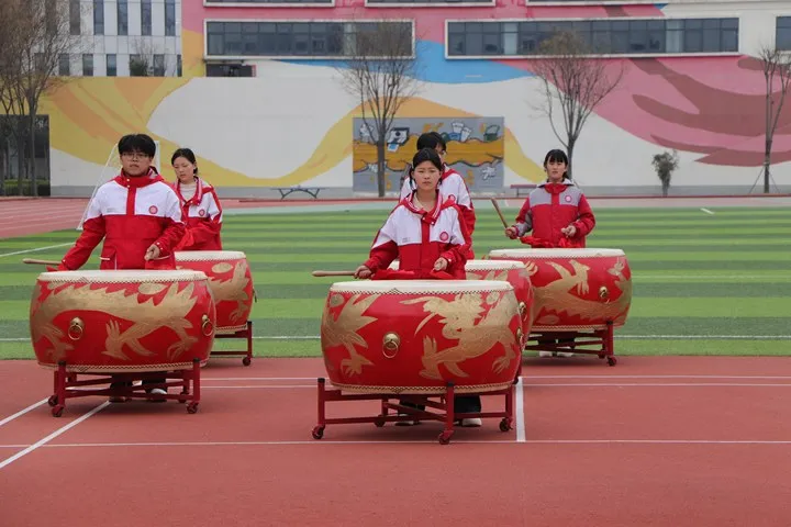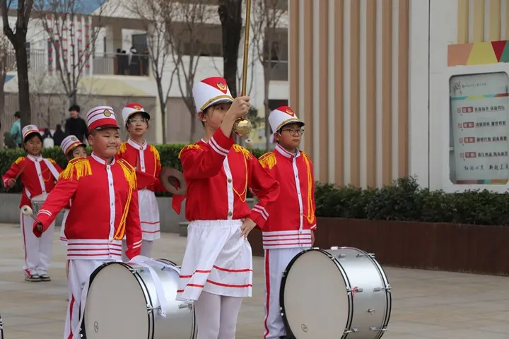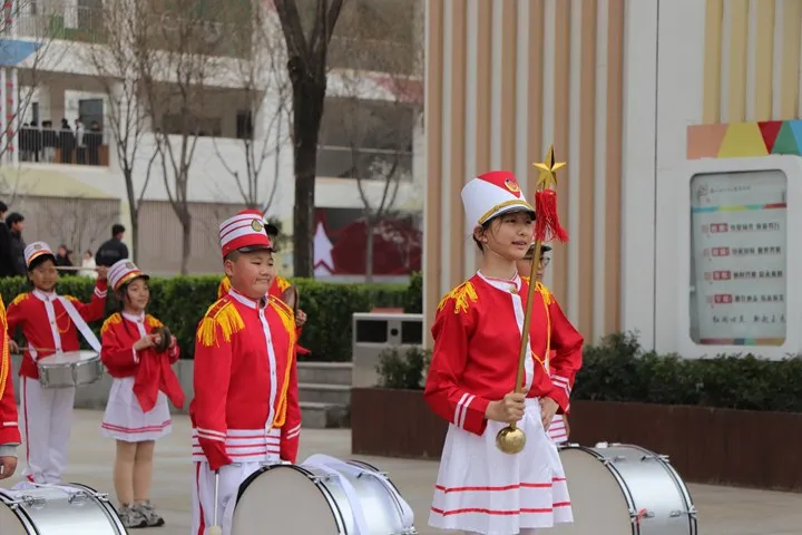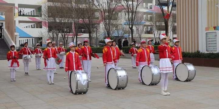 学校鼓号队奏响欢快乐章,少年们意气风发,铿锵旋律奏响共育新篇的美好期盼。
