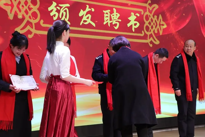 李彭科长与杨军伟校长为教联体专家指导委员会成员郑重颁发聘书,一份份聘书,是信任的托付,是责任的凝聚,更是家校社携手前行的坚实纽带,为教联体建设汇聚起专业磅礴的指导力量。