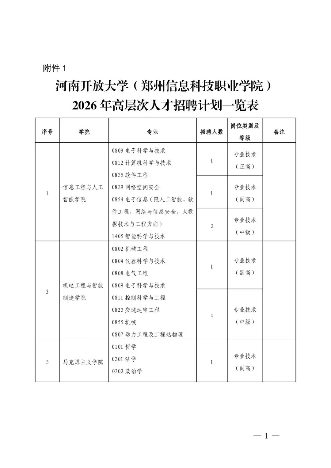 根据我校岗位空缺情况和事业发展需要,2026年拟公开招聘领军型人才、优秀博士、高技能人才、行业资深实践型人才20人。详见《河南开放大学(郑州信息科技职业学院)2026年高层次人才招聘计划一览表》(附件1)。