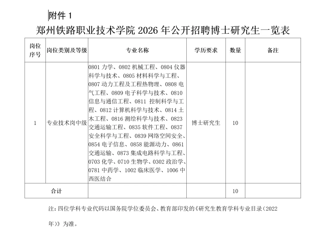 详见附件《郑州铁路职业技术学院2026年公开招聘博士研究生一览表》。