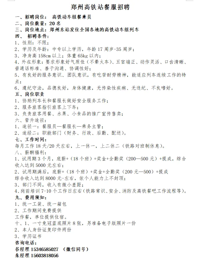 【最新招聘】郑州高铁站诚聘高铁动车组餐乘员,高薪福利职等你来!
