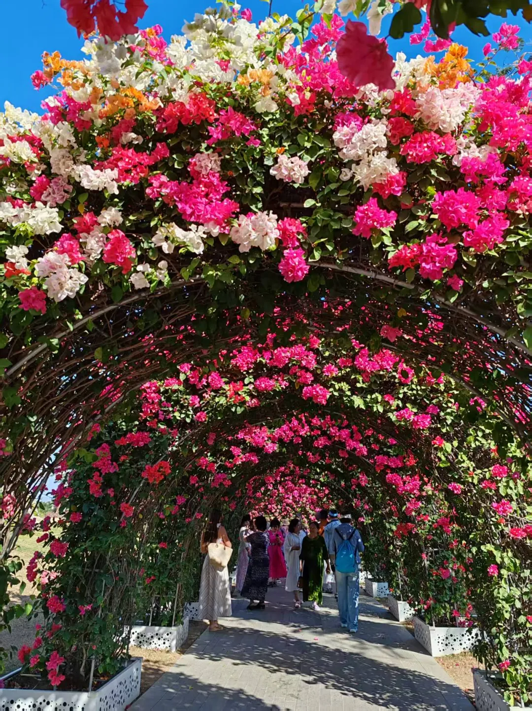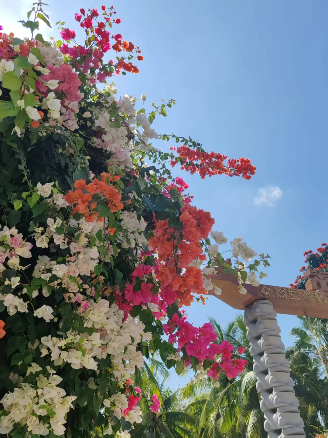 看崖州三角梅开,遍山岭霞光瑞霭。花廊花海秋千外,艳了琼台玉阶。〔过〕嫣红姹紫娇柔态,剪雪裁冰入画来。香风荡彩云生,春水漾溪流碧,佳人赏笑盈腮。比秀色,谁可占头牌。