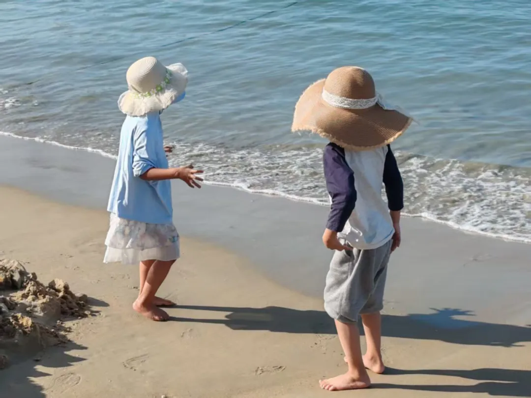 海边谁捉浪花花,垒堰分流小崽丫。潮退摊平脚底沙。噢呀呀,戏水娃遭水戏啦。