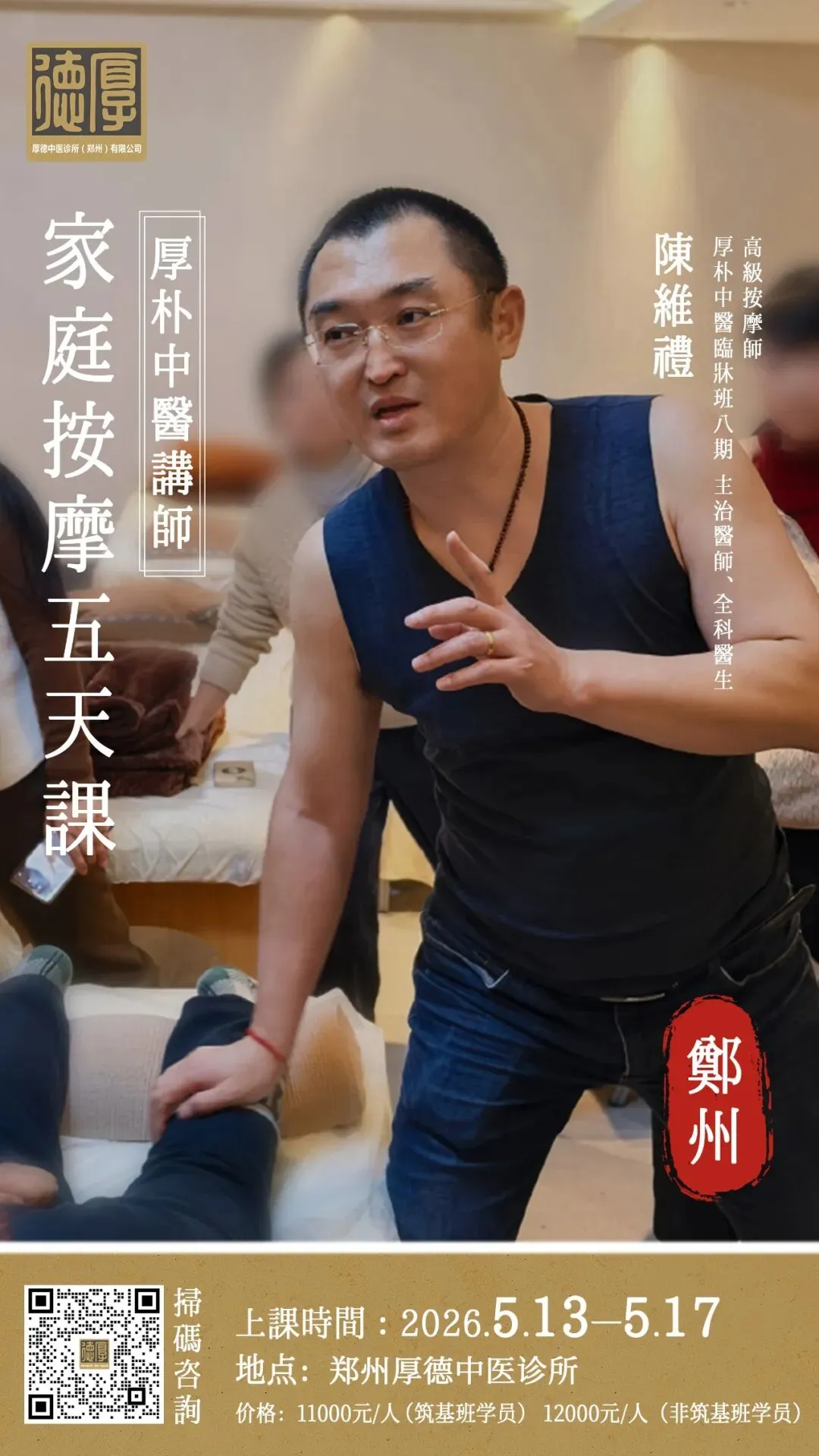 陈维礼老师家庭按摩5天课(5.13-5.17)正在火热招生中,现在报名享早鸟福利,扫码添加店长咨询报名相关事宜。