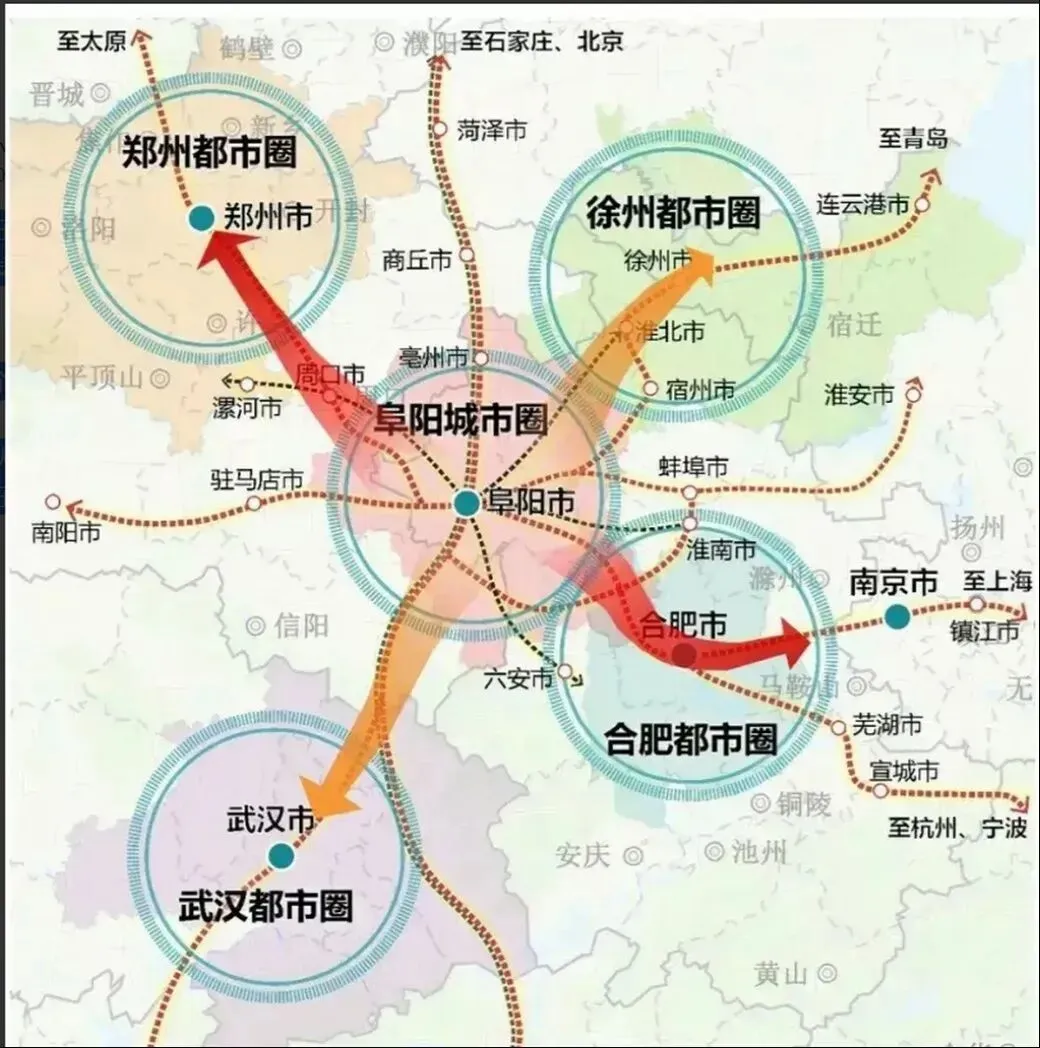 地处郑州、武汉、合肥、徐州的中间位置,同时还是国家京广铁路、京港高铁的必经之地。而经河南的郑阜高铁、商合杭高铁,是河南前往长三角地区不得不经过阜阳而已,并非阜阳从河南夺走的!