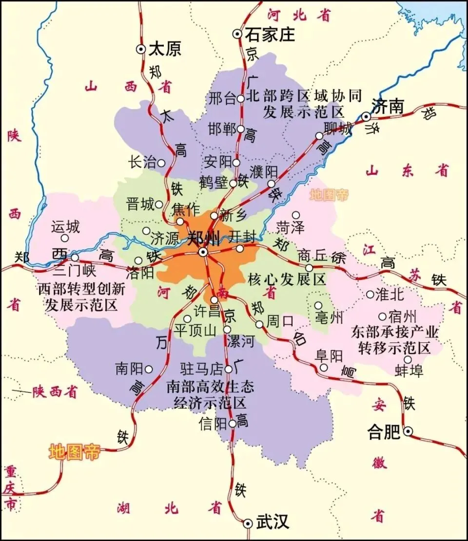 而河南省各城市放射状分布,就导致了河南的米字形高铁。