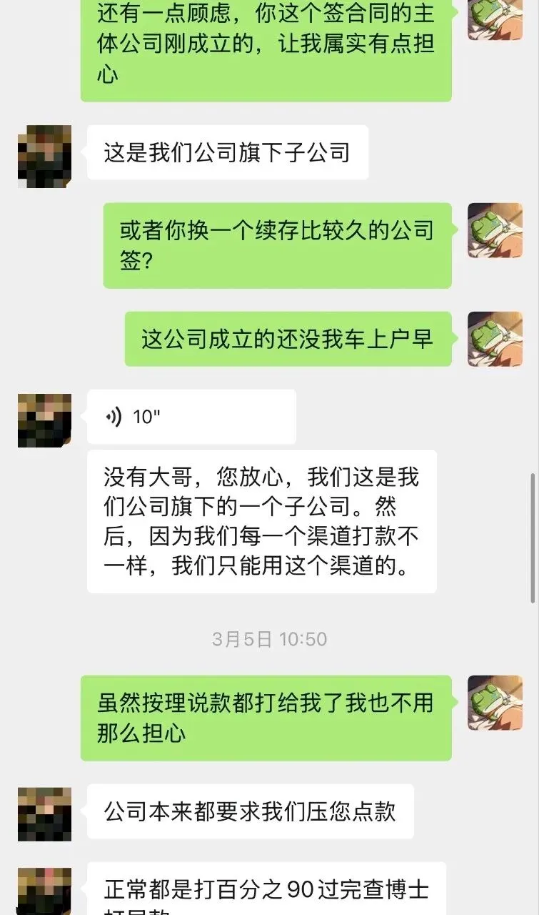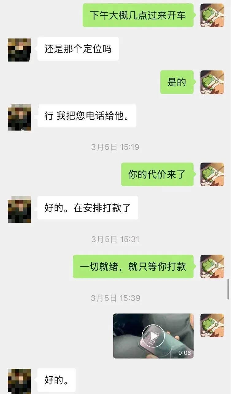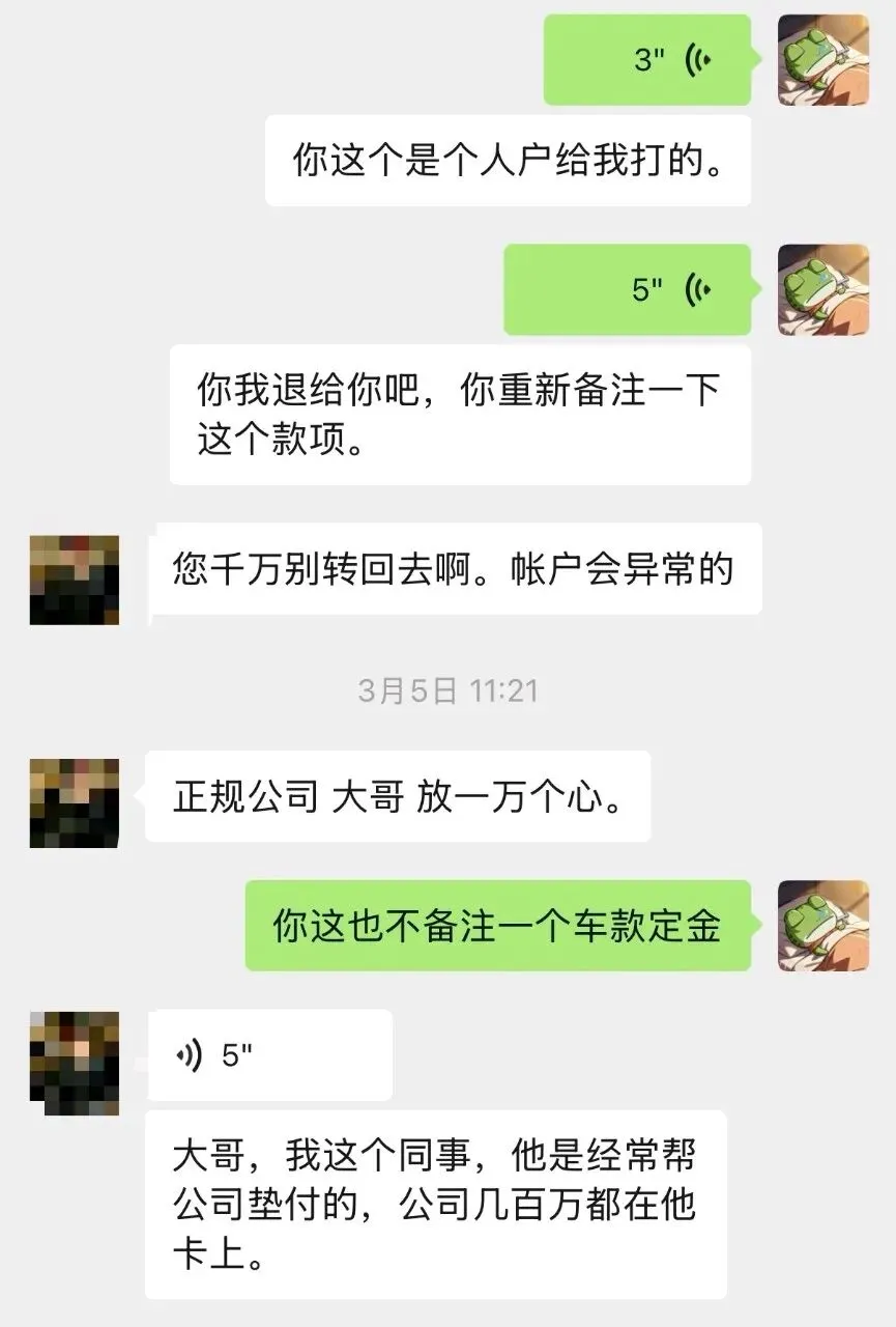 但这么大个事儿我都是过一晚再做决定,第二天让他再加五千块钱,就签合同交车,本以为对方会稍微讨价还价,但对方答应的很爽快,让我以为过完年的车市这么火热,新车优惠少了所以二手车价格也水涨船高。 随后对方拟定了一份合同电子版发给我,我查询了对方公司,并提出了质疑,但对方以全款的理由回应了我,我便没有深究,签署了合同后到账的第一定金是一个私人账户打过来的,我当时又提出了质疑,对方说是他同事。 随后我们约定好了交车时间,来开车的是他叫的代驾,至于开去了哪里,我也不清楚,反正代驾在开走之前我已经收到了两笔分开付进来的全款。