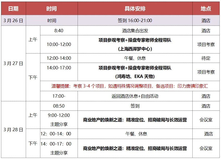 本次研学特邀业界操盘专家主题分享,系统梳理商业地产换新之道底层逻辑,并由老师全程带队,以“主题课程分享+实地考察”的方式,随行讲解,边看边学,身临其境感受不同类型商业项目细节。