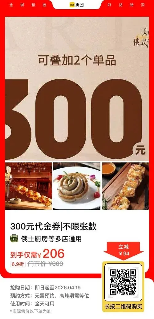 ✅ 206元抢原价300元代金券,6.9折吃罐牛/红菜汤/俄式烤串