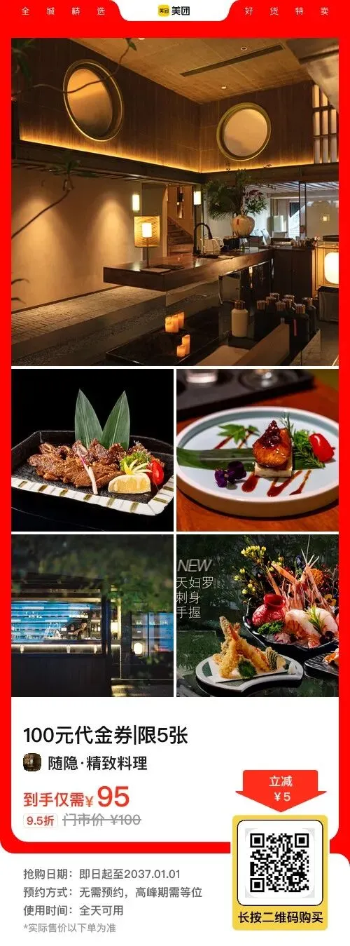 ✅ 95元抢原价100元代金券,9.5折吃日料/创意菜