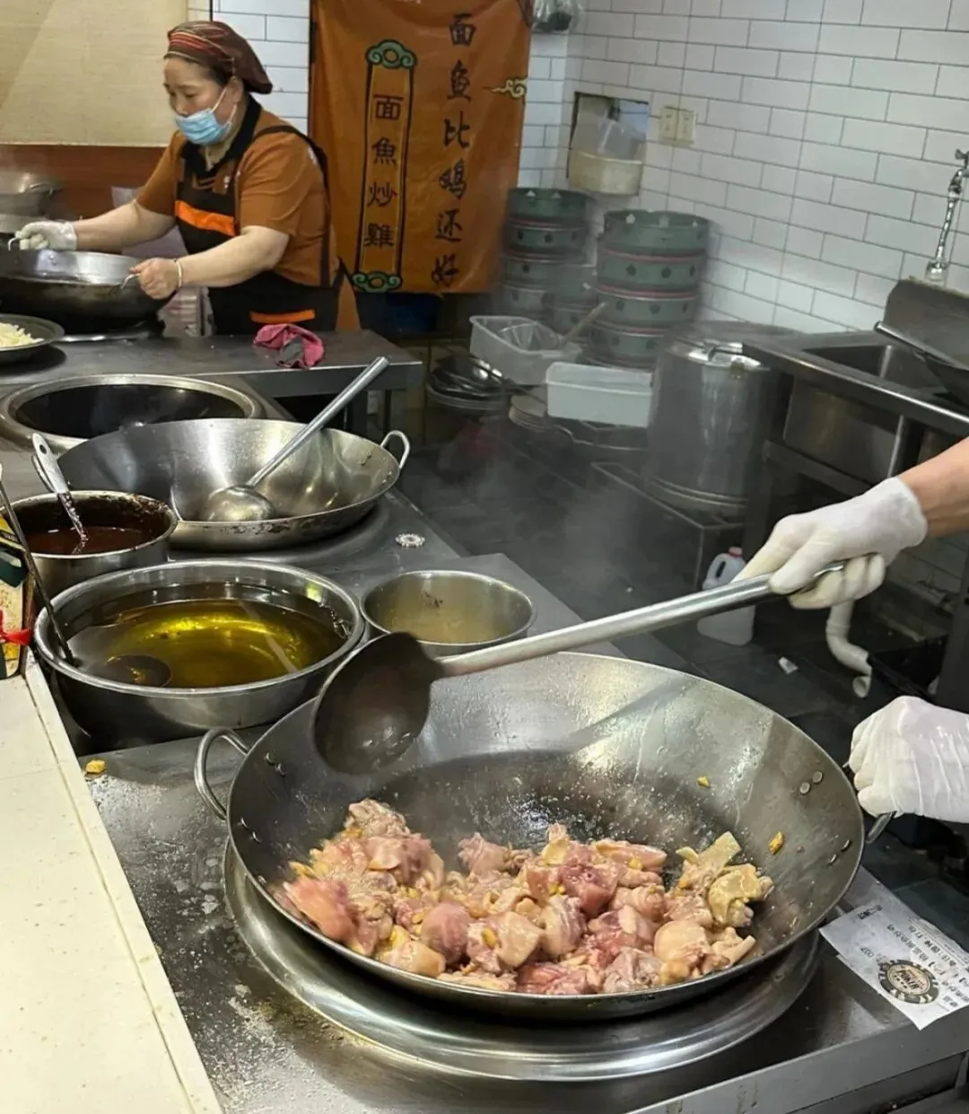 郑州这家面鱼炒鸡店先做的手工面鱼糯叽叽,滑溜溜,挂满了浓稠的酱汁,名厨现炒鸡肉裹满酱汁,嫩滑爽口,酱香中带着微辣好吃的不得了,他家的这个面鱼绝对是这道菜的灵魂,强烈推荐。