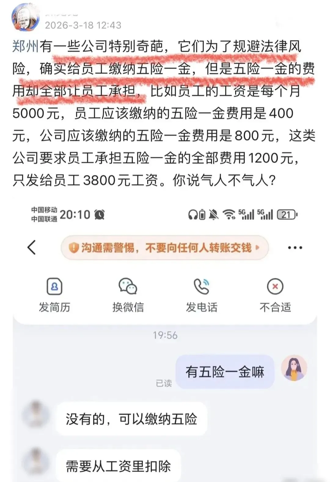3月18日,有网友在网络上爆料,郑州有一些公司特别奇葩,它们为了规避法律风险,确实给员工缴纳五险一金,但是五险一金的费用却全部让员工承担。