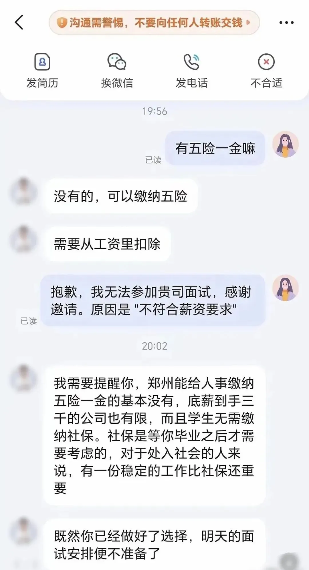 根据该网友提供的信息,这些信息源自某招聘平台后台的沟通记录。招聘方明确表示,能够缴纳五险一金,但费用必须从工资中扣除。并且特别指出,实习生无需缴纳社保。