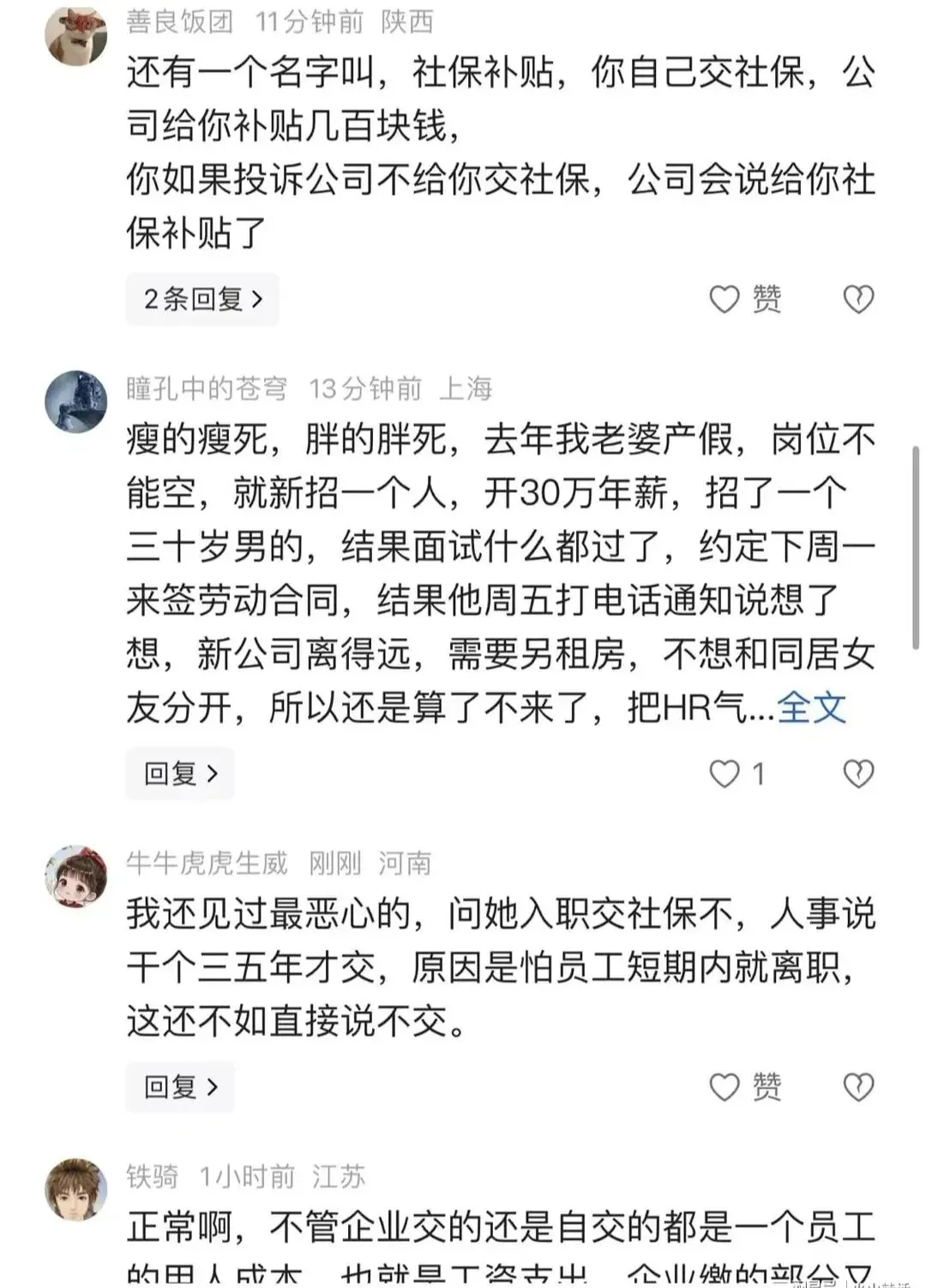 还有网友感慨,我还见过最恶心的,问她入职交社保不,人事说干个三五年才交,原因是怕员工短期内就离职,这还不如直接说不交。