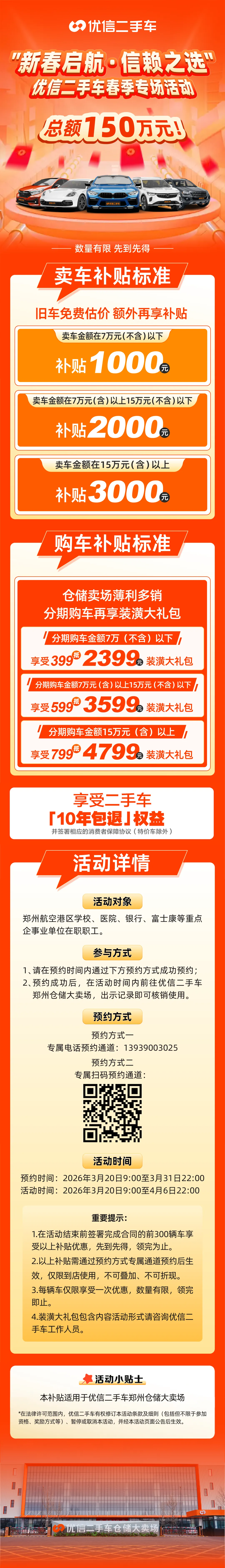 活动时间为3月20日至4月6日,预约通道于3月20日开启。有意向的职工可通过专属电话或扫码预约,到店即可享受专属权益:卖车成交价7万元以下补贴1000元,7万至15万元补贴2000元,15万元以上补贴3000元;分期购车还可享399元抵2399元、599元抵3599元、799元抵4799元三档装潢礼包。活动期间,仅限前300辆到店并在活动结束前签约的车辆享受优惠,先到先得,领完即止。
