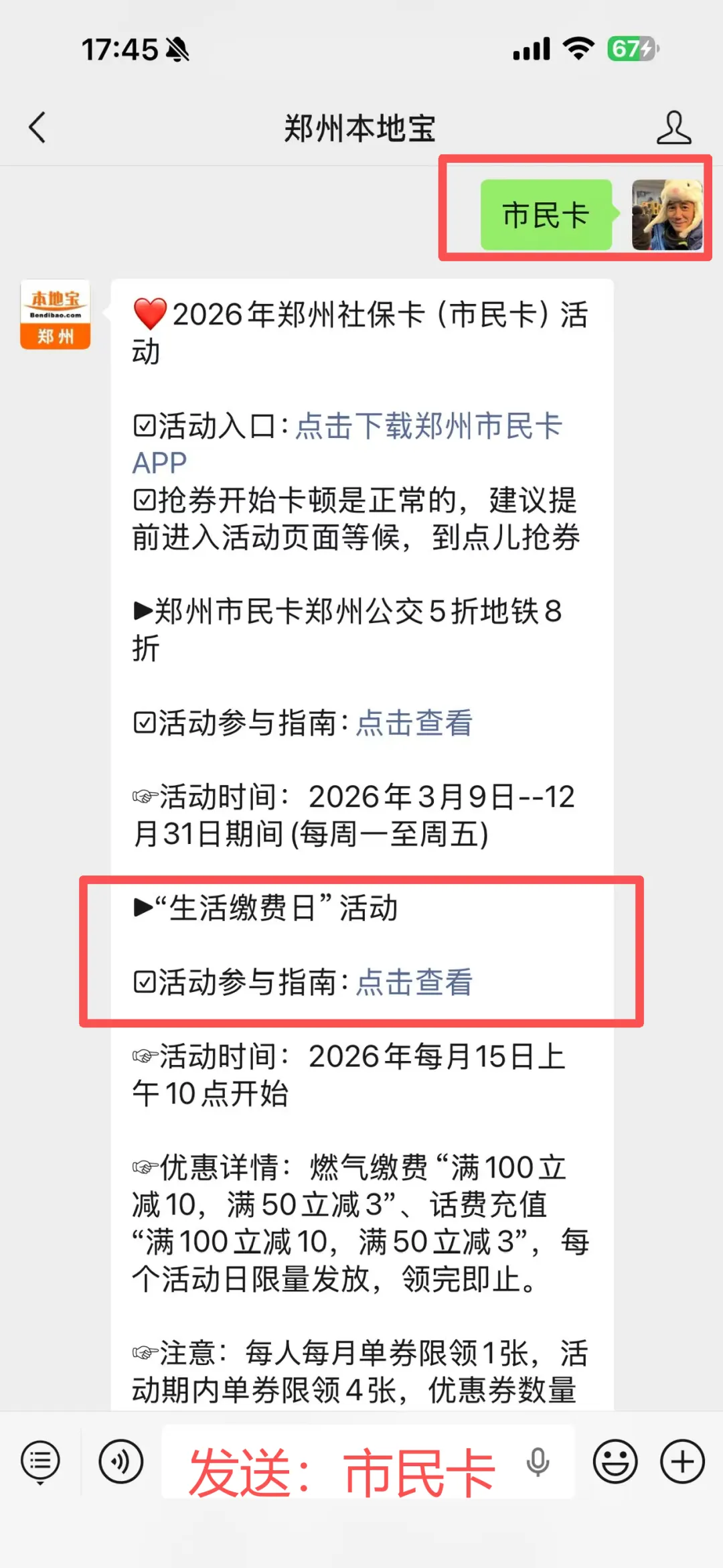 聊天对话框发送【市民卡】即可获取