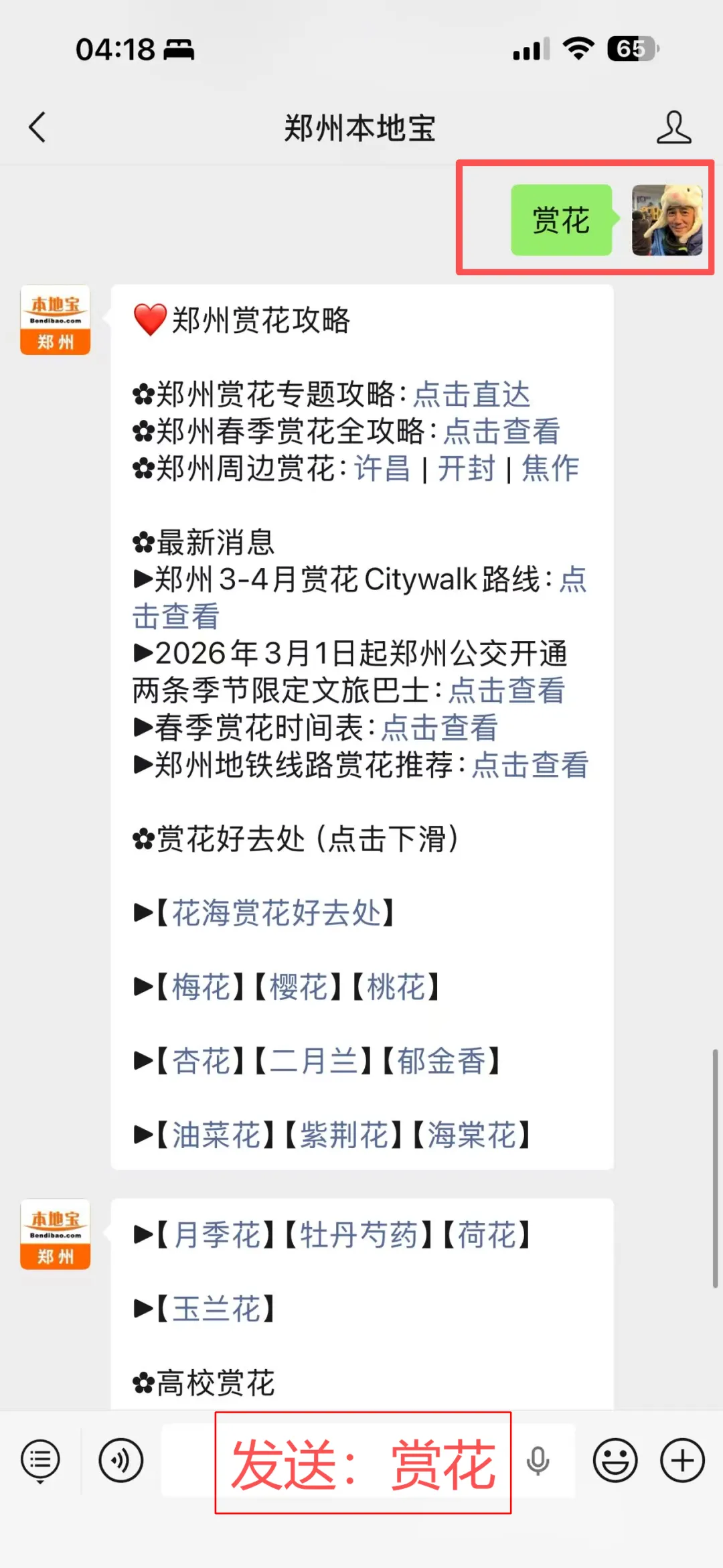 在聊天对话框回复【赏花】获取
