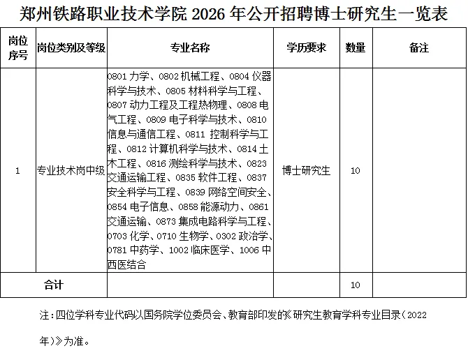 7.岗位所需的专业和其他条件详见《郑州铁路职业技术学院2026年公开招聘博士研究生一览表》。