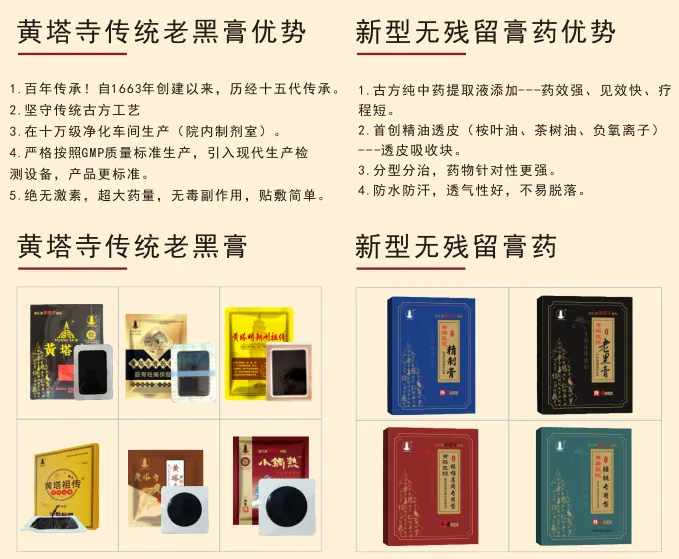 传统老黑膏、新型无残留膏药,古法炮制+现代工艺,效果温和持久。
