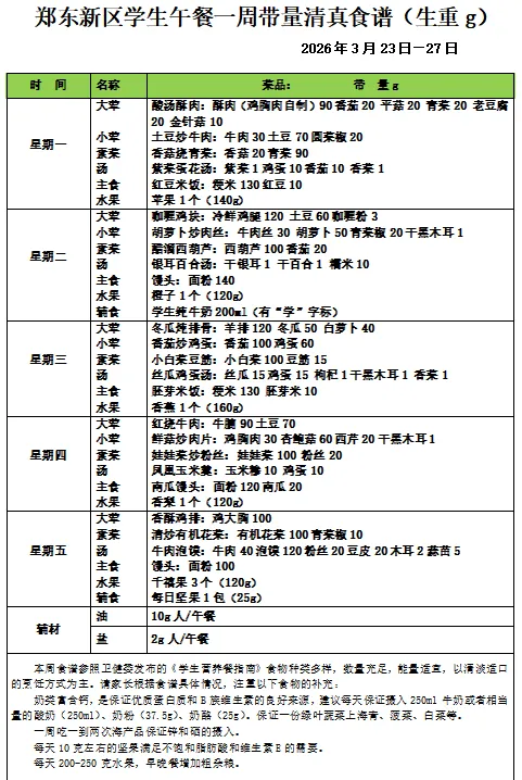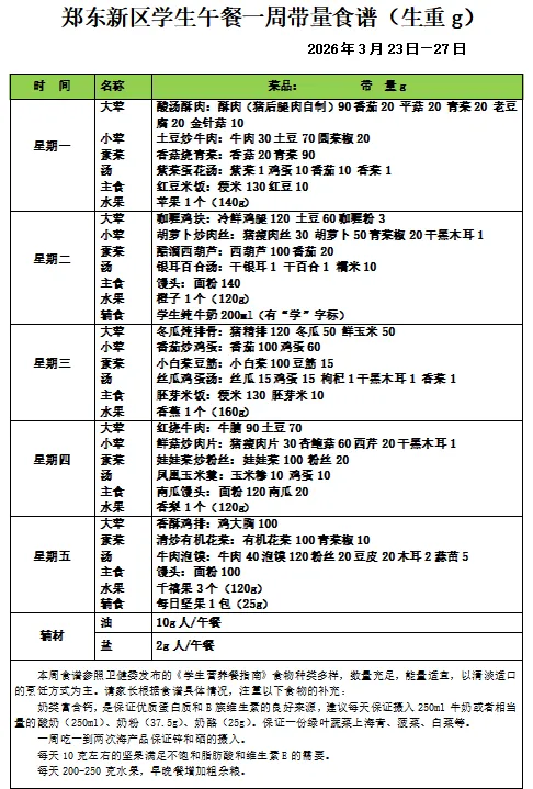 >郑州市郑东新区畅和街小学午餐一周(3月23日——3月27日)食谱