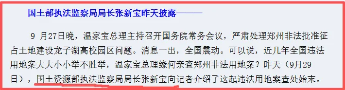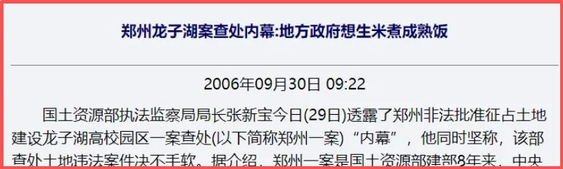 2005年2月,国土资源部执法监察局局长张新宝一行三人前往郑州,提前5分钟才通知当地部门要去龙子湖园区检查,经过5天调查,摸清了违法用地的全部情况。