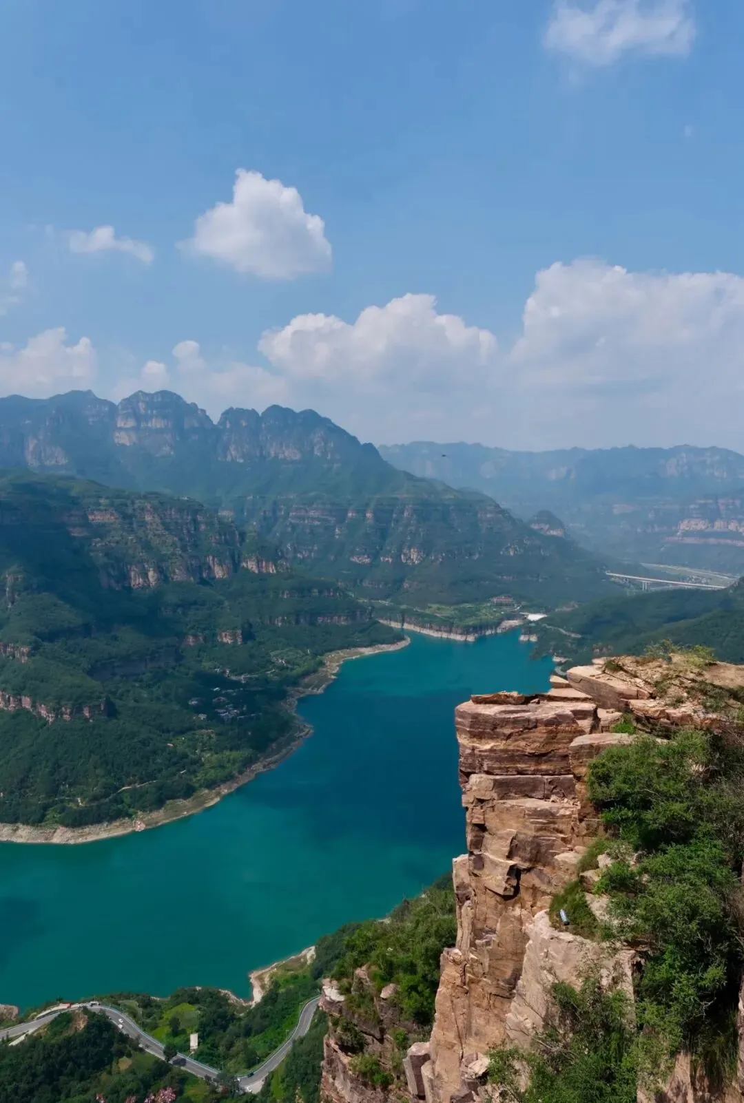 四周青山叠翠,湖面波光粼粼,如一面巨大宝镜镶嵌在深山之中。太行的雄伟山姿倒映在湖水里,刚柔相济。