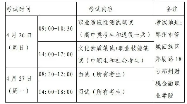 考试地址:郑州市管城回族区郑尉路18号。考生持本人准考证和身份证参加考试,4月25日14:00-18:00可在我校东北门门外查看考场分布图。报名、考试期间交通和食宿费用自理。