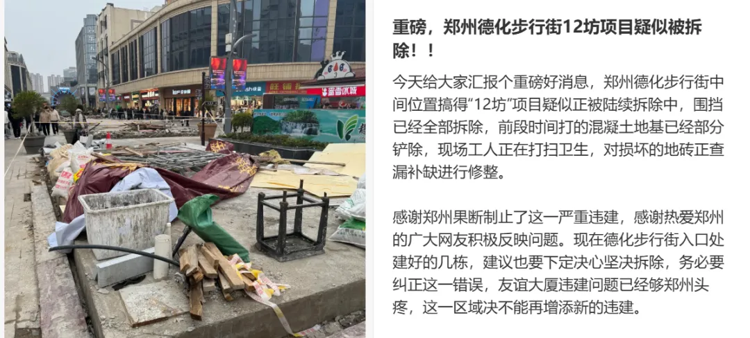 近日,有网友爆料称,郑州德化步行街“12坊”项目疑似正被陆续拆除中,围挡已经全部拆除,前段时间打的混凝土地基已经部分铲除,现场工人正在打扫卫生,对损坏的地砖正查漏补缺进行修整。消息一出,网友们热议纷纷。一部分网友认为之前此处并无建筑,基本为行人预留通道,其实保持原样就很好,增加这些所谓的建筑,看着太拥挤了;也有网友质疑,一建一拆太浪费了,当时是怎么通过审批的。二七商圈作为郑州古老又最具知名度的地标性商圈,这几年一直面临拆拆改改的情况。还有不少网友对于目前摆放的集装箱表示不满,认为严重拉低了城市形象;还有网友期盼友谊大厦能尽快拆迁。