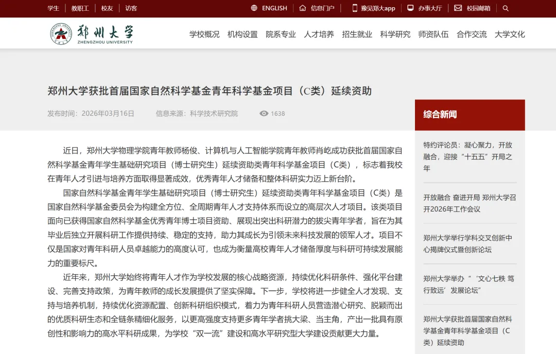 近日,据郑州大学官网显示,郑州大学物理学院青年教师杨俊、计算机与人工智能学院青年教师肖屹成功获批首届国家自然科学基金青年学生基础研究项目(博士研究生)延续资助类青年科学基金项目(C类),标志着郑州大学在青年人才引进与培养方面取得显著成效,优秀青年人才储备和整体科研实力迈上新台阶。国家自然科学基金青年学生基础研究项目(博士研究生)延续资助类青年科学基金项目(C类)是国家自然科学基金委员会为构建全方位、全周期青年人才支持体系而设立的高层次人才项目。该类项目面向已获得国家自然科学基金优秀青年博士项目资助、展现出突出科研潜力的拔尖青年学者,旨在为其毕业后独立开展科研工作提供持续、稳定的支持,助力其成长为引领未来科技发展的领军人才。项目不仅是国家对青年科研人员卓越能力的高度认可,也成为衡量高校青年人才储备厚度与科研可持续发展能力的重要标尺。近年来,郑州大学始终将青年人才作为学校发展的核心战略资源,持续优化科研条件、强化平台建设、完善支持政策,为青年教师的成长发展提供了坚实保障。下一步,学校将进一步健全人才发现、支持与培养机制,持续优化资源配置、创新科研组织模式,着力为青年科研人员营造潜心研究、脱颖而出的优质科研生态和全链条精细化服务,以更高强度支持更多青年学者挑大梁、当主角,产出一批具有原创性和影响力的高水平科研成果,为学校“双一流”建设和高水平研究型大学建设贡献更大力量。来源:郑州大学,爱科会易(Uconf.com)仅用于学术交流,若相关内容侵权,请联系删除。
