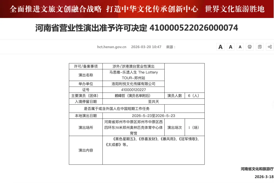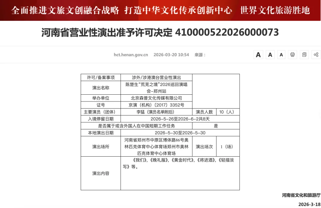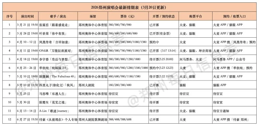 小编也为大家附上2026郑州演唱会排期表(3.20更新)